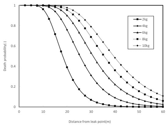 Since the Probit value corresponding to a death probability of 0.99 is 7.33, the distance of a death probability of 0.99 from the leak point can be calculated using Equations (1) and (8):