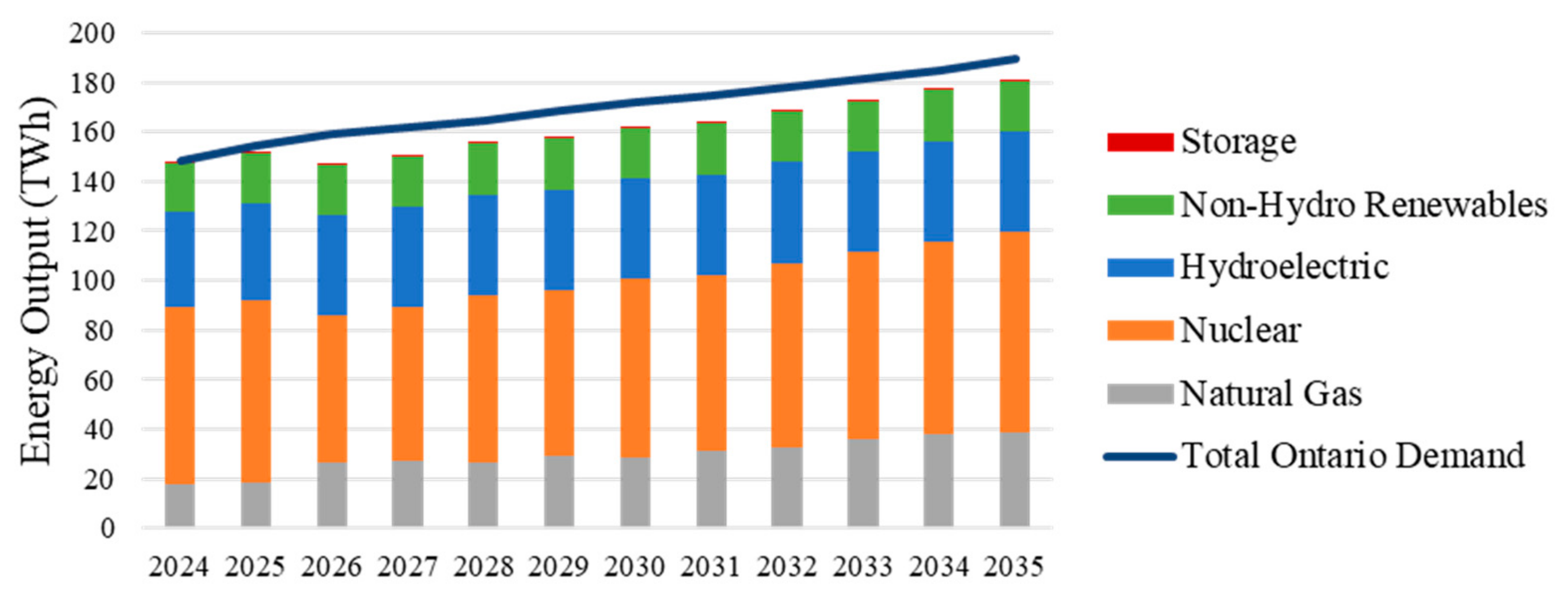 Figure 2 shows that a steady escalation ensues. By 2035, Ontario’s reliance on natural gas-generated electricity is projected to increase to 39 TWh, assuming existing resources (i.e., natural gas-powered turbines) continue to be available post-contract/commitment expiry [