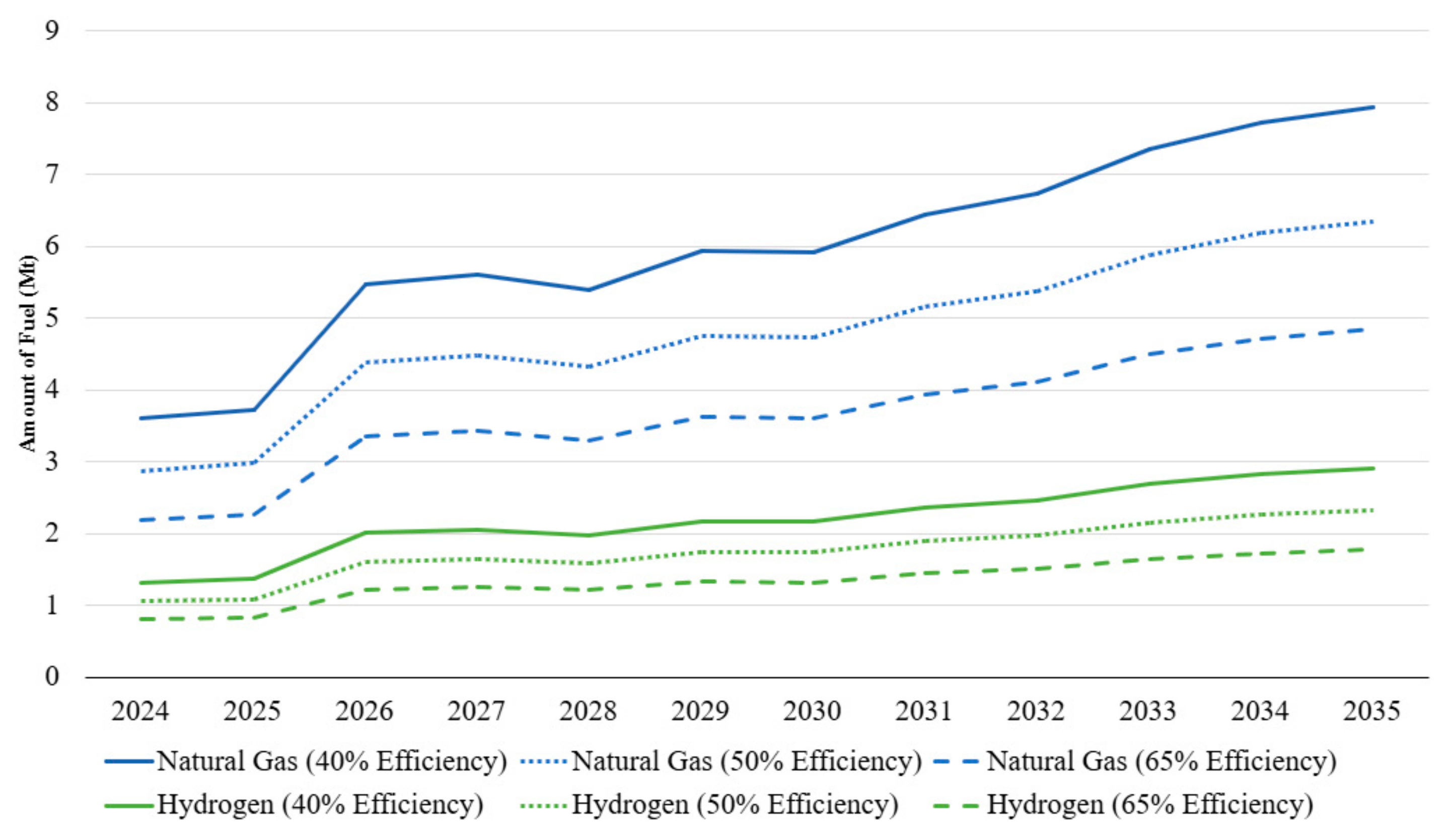Figure 3 offers insight into potential fuel requirements for power generation, considering different fuel types and turbine efficiencies over the 12-year period our research considers.