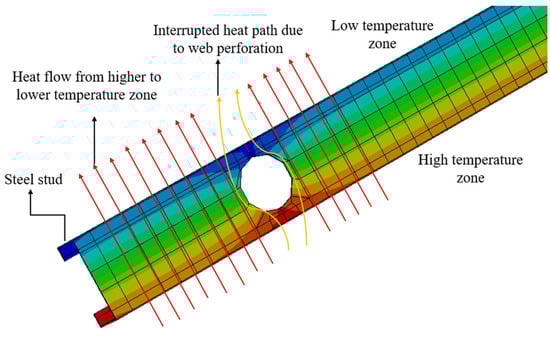- By reducing the steel web cross-sectional area, perforations interrupted the continuous through-stud conduction path and promoted lateral heat flux redistribution into the insulation. Heat flux vectors along the stud web decreased by 23.6–37.5%, with 2D and 3D isotherm analyses in THERM and Abaqus confirming flux redistribution and attenuated thermal bridging.