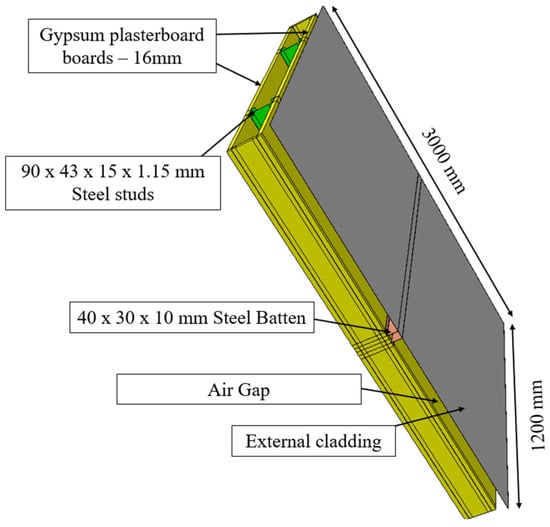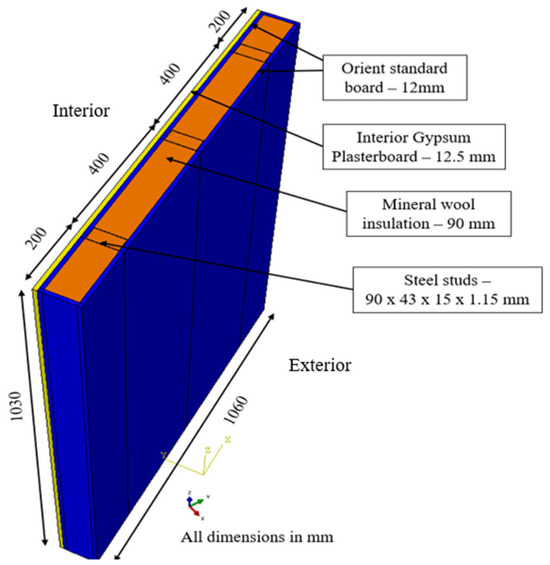 Experimental investigations into the thermal performance of LSF walls have played a critical role in validating numerical models used in estimating R-values. The benchmark study by Santos and Mateus [31] utilised a mini hot-box apparatus under quasi-steady-state conditions to evaluate the thermal resistance of both load-bearing and non-load-bearing LSF wall assemblies. The configuration of their load-bearing wall comprised three C90 × 43 × 15 × 1.5 mm steel studs at 400 mm spacing, with a 90 mm mineral wool core (λ = 0.035 W/m·K), 12 mm OSB on both faces, and an internal 12.5 mm gypsum plasterboard layer, resulting in a total thickness of 126.5 mm as shown in Figure 2. It measured 1030 mm × 1060 mm and included three symmetrically placed studs. The measured surface-to-surface thermal resistance was R = 1.558 m2·K/W. In this study, this reference load-bearing LSF wall was numerically modelled to evaluate its thermal performance using three-dimensional steady-state (3D) heat transfer analysis in Abaqus as shown in Figure 3. The 3D approach was adopted to better represent realistic heat flow in all spatial directions. Material conductivities were taken as 50 W/m·K for steel, 0.100 W/m·K for OSB, and 0.175 W/m·K for plasterboard. A temperature gradient of 35 °C was applied (40 °C hot side, 5 °C cold side), with heat fluxes recorded using four sensors positioned across the stud and cavity regions. The developed model was validated against measured surface-to-surface R values reported in [31].