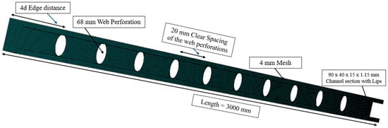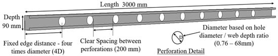 Moreover, the 1.5 mm thick CFS stud reported in the literature was replaced with a 1.15 mm thick section, consistent with the 3 m lipped channel stud experimentally investigated by Gunalan et al. [32] to allow structural capacity assessment. A parametric study was undertaken numerically in Abaqus, adopting the modelling methodology of Vy et al. [35] to evaluate the influence of web perforation geometry and spacing on the thermal and structural performance of CFS studs, aiming to enhance the thermal resistance of LSF walls. A total of 120 LSF configurations were evaluated by varying the web hole diameter to web depth ratio between 0.40 and 0.76, consistent with the limits defined in AS/NZS 4600 [36], National Association of Steel-Framed Housing (NASH) [37] and the NCC. Hole diameters ranged from 36 mm to 68 mm, with spacing between 120 mm and 450 mm along a 3000 mm stud length (Figure 6).