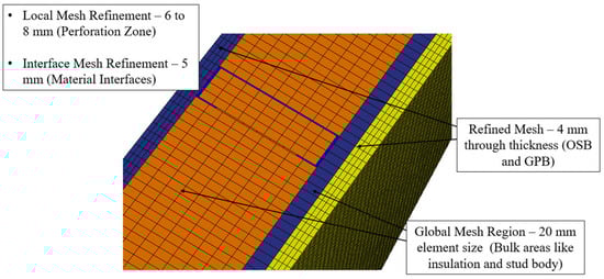 A 3D steady-state heat transfer model was developed in Abaqus/CAE 2023 [38] to evaluate the R-values of LSF wall assemblies, following the modelling framework of Ariyanayagam and Mahendran [39]. Several wall configurations were analysed, including (a) LSF wall specimens reported in the literature, measuring 1060 mm × 1030 mm with and without web perforations (Figure 3); (b) 1200 mm × 3000 mm walls with and without perforations (Figure 5); and (c) external wall assemblies with cladding, also measuring 1200 mm × 3000 mm. Configurations (b) and (c) incorporated two C90 × 43 × 15 × 1.5 mm LSF studs spaced at 600 mm, while configuration (a) used 400 mm spacing and were connected by top and bottom tracks. In configurations involving external walls, CFS battens were included. Components were assembled with spatial alignment and tie constraints ensured thermal continuity at all interfaces. All materials, including LSF framing, oriented strand board (OSB), gypsum plasterboard (GPB), and mineral wool insulation, were modelled as 3D homogeneous deformable solids using 3D eight-node linear brick elements with first-order temperature interpolation. A mesh independence study was performed to ensure accuracy of both thermal and structural simulations. Five mesh densities were examined: coarse (8 mm), medium (4 mm), and fine (2 mm). The predicted R-values for the reference wall varied by less than 1.2% between medium and fine meshes, while the axial capacity of the perforated stud differed by only 0.9%. Very fine mesh led to longer numerical simulation time. The final scheme applied a 20 mm global mesh to bulk regions such as insulation and stud bodies, 4 mm refinement through plasterboard and OSB layers, 5 mm elements at material interfaces, and 6 to 8 mm refinement around perforation zones to resolve heat-flux redistribution and stress concentrations. Mesh sensitivity analysis confirmed that further refinement produced negligible changes in the R-value, validating the mesh strategy. The final mesh configuration is illustrated in Figure 7. A steady-state heat transfer analysis was conducted to compute the temperature distribution and determine the R-value.