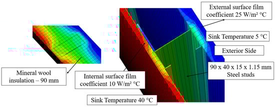 Thermal boundary conditions and heat transfer processes were defined following established finite element (FE) methods for LSF walls [40], as shown in Figure 8. Heat transfer was modelled by incorporating conduction through solid materials and convection at internal and external surfaces, while radiation was neglected under the steady-state assumption. Interfaces between LSF framing, OSB, plasterboard, and insulation were modelled using tie constraints with a tolerance of 0.0001 mm, automatically assigned through the contact detection algorithm in Abaqus. Surface film coefficients of 10 W/m2·K on the interior OSB surface and 25 W/m2·K on the exterior plasterboard face were applied, consistent with ASHRAE guidelines for vertical surfaces under natural convection, consistent with ASHRAE guidelines for vertical surfaces under natural convection [3]. To reflect the imposed temperature difference in experimental setups, boundary temperatures of 40 °C and 5 °C were used to simulate the experimental thermal gradient. Subsequently, a steady-state heat transfer step was employed with solver settings optimised for numerical stability. Surface heat flux results were used to calculate the R-value based on ISO 10211 2017 [34], and the modelling framework complied with NZS 4214 2006 for thermal resistance evaluation in LSF systems.