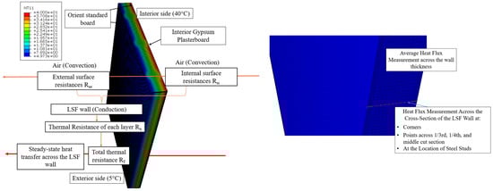 These formulations, applied under isotropic and homogeneous material assumptions, enabled robust calculation of the U and R-values while capturing directional thermal bridging effects introduced by CFS framing and web perforations using Abaqus as shown in Figure 9. Furthermore, Abaqus simulations incorporated appropriate thermal boundary conditions and calibrated material properties, with the resulting heat flux output (ϕ), used to compute the U-value and total thermal resistance of the LSF wall system.