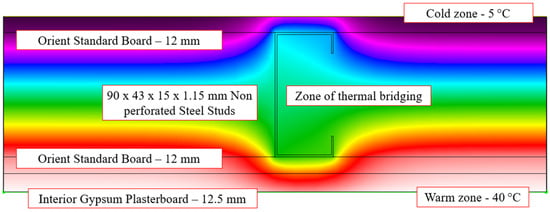 Two-dimensional steady-state thermal analysis was conducted in THERM (v7.8.2) to complement the 3D simulations in Abaqus (Figure 10). THERM was selected due to its widespread application in modelling planar conductive heat transfer in layered building envelopes. It was used alongside Abaqus to compare 2D and 3D thermal behaviour in the LSF wall assembly. The cross-sectional geometry and material properties were identical to those used in Abaqus and based on validation against experimental data from [31]. All materials were modelled as homogeneous and isotropic, with constant thermal conductivities assigned from standard references. Boundary conditions included fixed surface temperatures (40 °C interior, 5 °C exterior), and surface resistances were applied in accordance with ISO 6946:2017. These were applied as inputs but subtracted from the results to isolate the surface-to-surface R-value, in accordance with the referenced method. Mesh refinement was applied near material interfaces to capture thermal gradients while maintaining computational efficiency. Radiative and transient effects were neglected under the steady-state assumption. R-values were obtained directly from the simulation output. For perforated configurations, the thermal resistance was determined using a weighted average across perforated and adjacent solid web regions to account for the planar geometric simplification inherent to 2D THERM modelling.