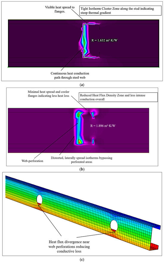Results of LSF walls: (a,b) 2D Isotherm and heat flux distribution of a solid and web-perforated stud in THERM model; (c) 3D localized resistance zones in Abaqus model.