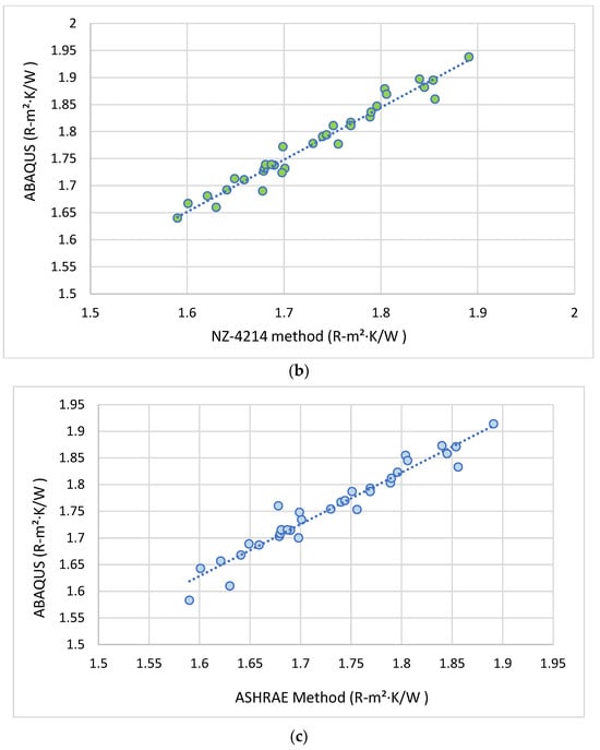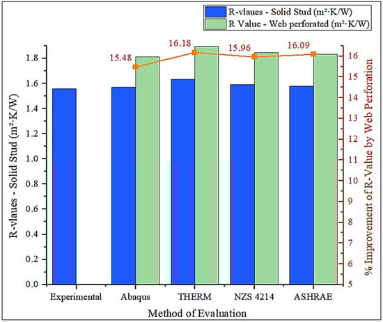 Among the numerical methods, the highest R value of 1.896 m2·K/W was achieved by the 2D THERM simulation, representing a 16.18% improvement over its non-perforated counterpart (Figure 14). NZS 4214 and the ASHRAE Modified Zone methods predicted R values of 1.845 and 1.833 m2·K/W, corresponding to respective improvements of 15.96% and 16.09%. The 3D Abaqus model produced an R value of 1.813 m2·K/W, indicating a 15.48% increase. Although 2D and analytical models offer computational efficiency, they assume planar conduction and uniform cross-sections, thereby overlooking multidirectional heat transfer effects that are critical in perforated configurations. In contrast, the 3D modelling approach resolves cross-plane heat fluxes, localized thermal bridging zones, and multiaxial conduction paths, offering a more accurate representation of the thermal behaviour of perforated LSF wall systems [41].
