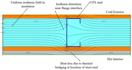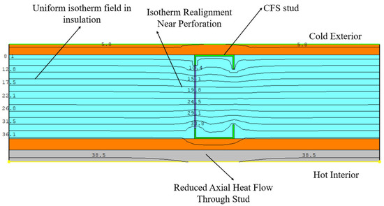 Figure 15 depicts the thermal response of the non-perforated LSF wall, where uniformly spaced, orthogonal isotherms in the insulation zones signify idealised one-dimensional conduction governed by Fourier’s law (q = −k ∇T). As the isotherms approach the steel stud, they bend sharply and become highly compressed, especially within the web, reflecting steep thermal gradients and concentrated axial heat flux. This distortion illustrates anisotropic conduction and confirms the formation of a pronounced thermal bridge, as the high-conductivity steel provides a low-resistance path that short-circuits the surrounding insulation. In contrast, Figure 16 (perforated stud) reveals a disruption in isotherm alignment through the web, where geometric discontinuities attenuate axial conduction and redistribute heat laterally into the adjacent insulation. The contours are more widely spaced within the web zone, indicating increased local resistance and diminished gradient magnitude.
