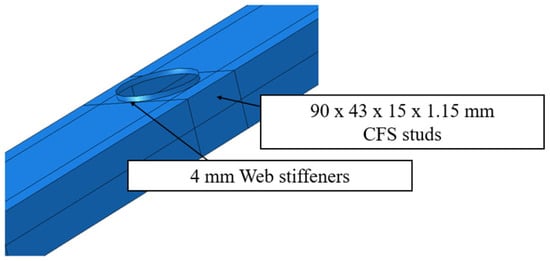 Following model validation, web perforations were introduced to the studs of the same LSF wall configuration to mitigate thermal bridging and investigate their influence on conductive heat transfer pathways. Five perforations with a diameter of 45 mm were introduced with a clear spacing of 160 mm between adjacent holes. The resulting effects on isotherm alignment and heat flux redistribution were investigated. Furthermore, a 1200 mm × 3000 mm wall with non-perforated CFS stud was developed in Abaqus to represent full scale LSF construction, as shown in Figure 5. Previous studies show that wall width has minimal impact on thermal resistance under steady-state conditions due to predominantly one-dimensional heat flow [33,34]. The 3 m height was adopted to enable axial conduction study along solid studs, followed by assessment of the potential thermal impact of introducing web perforations and the associated reduction in steel cross-sectional area. The R-value obtained from this configuration was used as a reference for subsequent analyses. To assess the influence of geometric modifications on thermal resistance, the model was then extended by incorporating circular web openings in the steel studs (Figure 5).