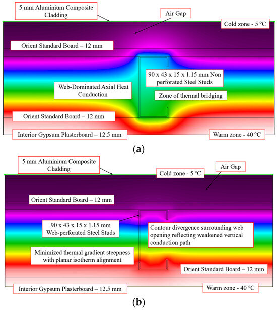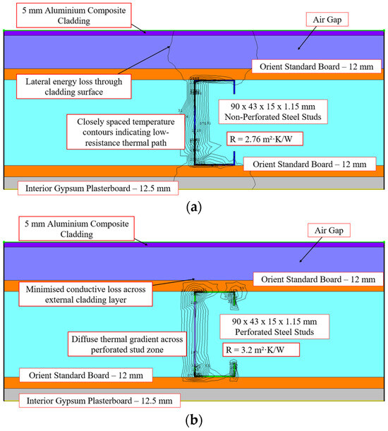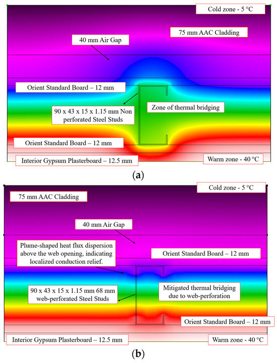 In AAC-clad LSF walls, the 75 mm aerated concrete layer attenuates surface heat flux through low-conductivity, high-porosity material, suppressing conductive transport at the cladding-cavity interface. In the non-perforated case, the 90 × 43 × 15 × 1.15 mm steel stud acts as a dominant thermal bridge, concentrating axial conduction through the web, as evidenced by steep gradients and compressed isotherms at the AAC–stud and flange–cladding junctions (Figure 22). R-values across methods range from 2.71 to 2.83 m2·K/W. Introducing 68 mm web perforations interrupts the longitudinal heat pathway, promoting lateral flux redistribution into adjacent insulation. As shown in Figure 23, perforations induce plume-shaped diffusion fields and smoother isothermal gradients across the stud–cavity domain. This geometry increases thermal resistance to 3.12–3.27 m2·K/W, reflecting a 15.13 to 16.48% improvement. Perforations thus reduce directional conduction continuity, enabling more uniform energy transport and enhancing the thermal resistance of the wall system.