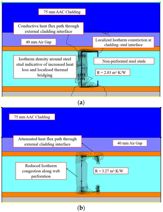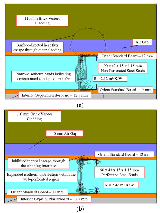 Isotherm distribution in brick veneer-clad external LSF wall with (a) non-perforated and (b) web-perforated studs.