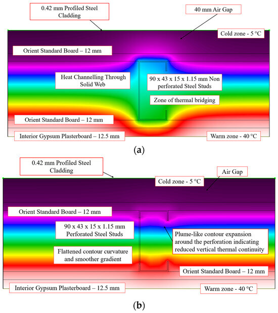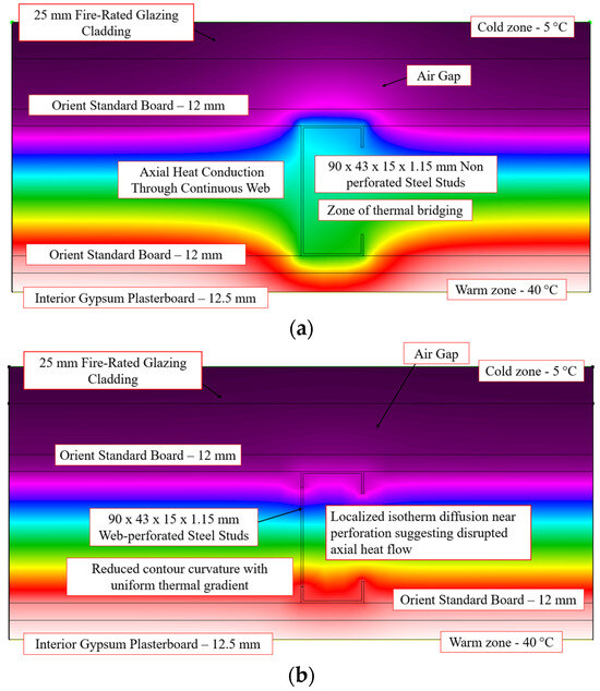 Isotherm distribution in fire-rated glazing-clad external LSF Wall with (a) non-perforated and (b) web-perforated studs.