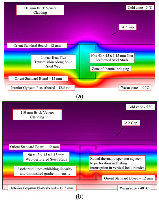 In brick veneer-clad LSF walls, the thermal field is shaped by the high thermal mass and moderate conductivity of the 110 mm external masonry layer. In the non-perforated configuration, axial conduction dominates along the steel web, with dense isotherms and steep gradients forming a narrow conduction channel from exterior to interior (Figure 30 and Figure 31). These concentrated flux pathways yield R-values between 2.57 and 2.70 m2·K/W. Introducing 68 mm web perforations interrupts this direct conduction stream, enhancing lateral thermal diffusion into the surrounding insulation. As shown in Figure 30b and Figure 31b, isotherms exhibit radial dispersion around the perforations, reduced curvature, and broadened thermal contours, especially near flange and floor junctions. These modifications redistribute the thermal gradient and suppress interface leakage. The improved energy spread raises R-values to 2.95–3.13 m2·K/W, corresponding to a 14.79–17.42% improvement. This confirms that geometric disruption of axial heat paths enhances thermal resistance, even under heavy cladding conditions where mass effects dominate.