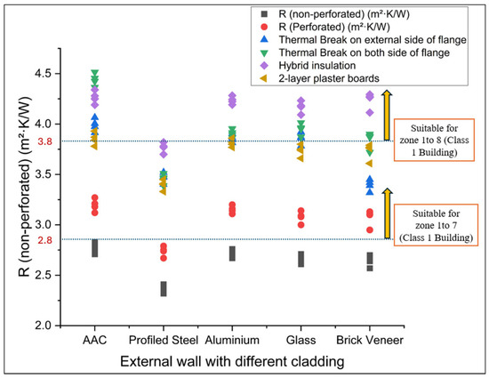 Comparison of R-values of external LSF walls with web-perforated studs across different cladding types with thermal enhancement strategies.