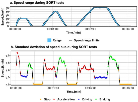 During the electric buses’ run, the consumed and recovered energy were analysed in conditions consistent with the SORT procedure. Using a Yokogawa WT-1806 power analyser, the consumed and recovered energy were recorded. The readings as time series and present a sequence representing consumed and recovered energy accordingly, and the sequence presents IECR, where . The impact of the bus run on consumed and recovered energy was analysed, specifically the speed, vehicle acceleration, and battery capacity. The vehicle’s run was described by its periods in —acceleration, —braking, —driving, and —stop states, as well as the number of batteries installed in the vehicle. Particular attention was paid to instantaneous energy consumption during acceleration and energy recovery during braking. For each battery count, 10 runs lasting 3 min were performed. High repeatability of the driving conditions was achieved thanks to the driver’s precise driving, who reproduced the speed profile in each run with high compliance with the assumed cycle. Figure 1a shows the area circled in blue, illustrating the range between the highest and lowest speeds at each test moment, while Figure 1b shows the standard deviations as a function of cycle time. To facilitate the analysis of journey repeatability, Figure 1b shows the standard deviation (black curve) of speed measurements during the SORT test, where the states in which the vehicle was moving are marked for each moment.