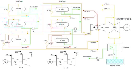 CCPPs consist of three main components: a gas turbine (GT), a heat recovery steam generator (HRSG), and a ST. Their operating principle relies on the integration of the Brayton cycle in the GT with the Rankine cycle in the ST [19,20]. This integration enables efficient utilization of the fuel’s energy, as electricity is generated from both GT and ST. The CCPP investigated in this study features a multishaft configuration with two GTs and one ST, and has a gross installed capacity of 950 MW. This configuration ensures high thermal efficiency and enables the system to respond flexibly to load variations. The energy generation cycle of the plant begins with the compression of air in the compressor. The compressed air is delivered to the combustion chamber, where it is mixed with fuel and undergoes the combustion process. As a result of the combustion process, a high-temperature, high-energy flue gas flow is produced. These hot gases pass through the GT to generate mechanical energy, which is then converted into electricity by a generator. Since the exhaust gases leaving the GT still contain a significant amount of thermal energy. While this energy is lost in conventional simple cycle power plants, it is recovered in the HRSG through CCPP technology. This energy is not released directly into the atmosphere. Instead, it is utilized in the HRSG to produce superheated steam. The generated steam is then directed to the ST, where additional electricity is produced. Thus, the combined operation of the GT and ST enhances the overall efficiency of the system. After completing its work in the ST, the low-energy steam is directed to the condenser. Here, heat transfer takes place with the cooling water circulated by the main cooling water pumps, and the steam is condensed back into liquid form. The condensate is then returned to the HRSG by a condensate extraction pump, restarting the cycle. CCPPs stand out with their high efficiency, low emission levels, and excellent load-following capability in situations requiring flexibility. Thanks to these features, they play a crucial role in both energy supply security and environmental sustainability. Figure 1 presents the flow diagram of the plant under study.