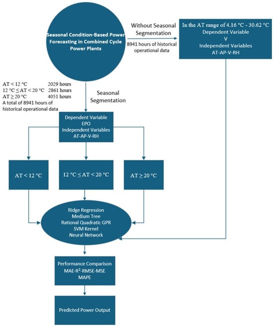 This study develops an innovative framework that utilizes real-time operational data to forecast electrical power output (EPO) in Combined Cycle Power Plants (CCPPs) by employing a temperature segmentation-based modeling approach. Instead of using a single general prediction model, which is commonly seen in the literature, three separate prediction models were created to explicitly capture the nonlinear effect of ambient temperature (AT) on efficiency (AT < 12 °C, 12 °C ≤ AT < 20 °C, AT ≥ 20 °C). Linear Ridge, Medium Tree, Rational Quadratic Gaussian Process Regression (GPR), Support Vector Machine (SVM) Kernel, and Neural Network methods were applied. In the modeling, the variables considered were AT, relative humidity (RH), atmospheric pressure (AP), and condenser vacuum (V). The highest performance was achieved with the Rational Quadratic GPR method. In this approach, the weighted average Mean Absolute Error (MAE) was found to be 2.225 with seasonal segmentation, while it was calculated as 2.417 in the non-segmented model. By applying seasonal prediction models, the hourly EPO prediction error was reduced by 192 kW, achieving a 99.77% average convergence of the predicted power output values to the actual values. This demonstrates the contribution of the proposed approach to enhancing operational efficiency.