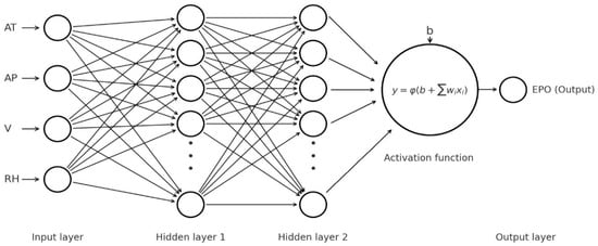 A typical ANN consists of three main structures: an input layer, one or more hidden layers, and an output layer. The operation of an ANN can be summarized as follows: (i) data are received by the input layer of the network and transferred to the first hidden layer; (ii) each neuron in a hidden layer performs a weighted operation on the inputs it receives, after which an activation function is applied to this output and the result is passed to the next layer; and (iii) this chain of operations continues until the output layer is reached, where the network produces its final output. This layered structure enables ANNs to achieve high levels of success in solving a wide variety of problems [33]. Figure 3 illustrates the architecture of the ANN model used in this study.