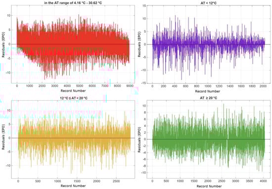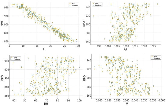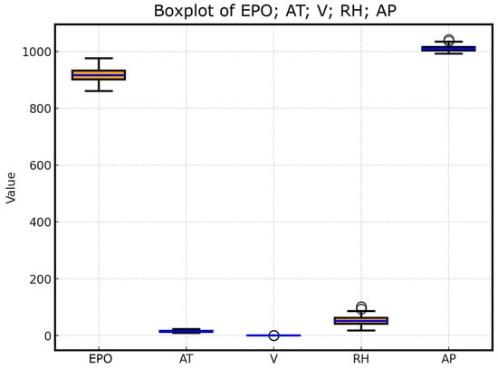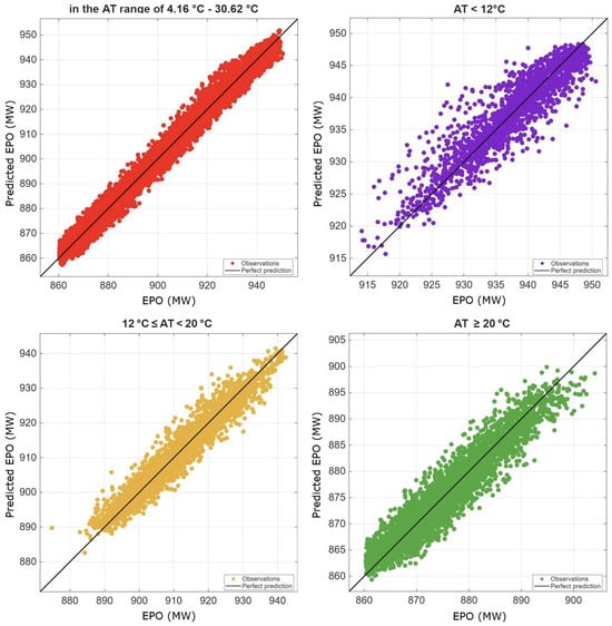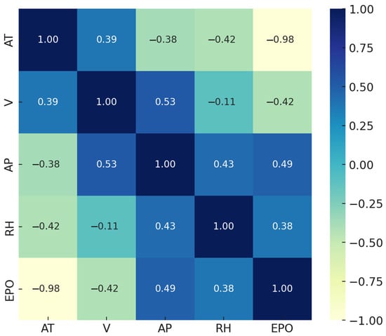 The initial modeling process was carried out using approximately 8941 h of full-load data and was performed on the entire dataset without applying temperature segmentation. Correlation analyses revealed that AT is the most influential variable on EPO, with a strong negative relationship. This finding highlighted the necessity of considering temperature as a separate parameter in the modeling process.