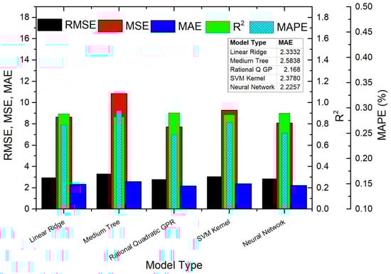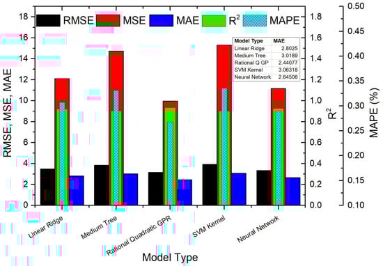 To evaluate the accuracy and reliability of quantitative models, dimensional error metrics are commonly used in performance analysis, with MAE being one of the most widely applied [36]. MAE is the average of the absolute differences between the predicted values of a model and the actual values. Instead of squaring the differences, it calculates only the average of their absolute values. This metric reflects the model’s average prediction error and is less sensitive to large errors. The formula for calculating MAE is given below [13,14,16,35,37]: