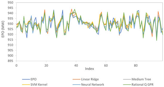 Figure 15 the performances of five different models used to predict EPO are compared. The graph was prepared for conditions where AT < 12 °C. As can be seen, all models successfully captured the overall trend and produced predictions quite close to the actual values. However, the Rational Quadratic GPR model was found to reflect the fluctuations more accurately and to achieve the closest fit to the actual values.