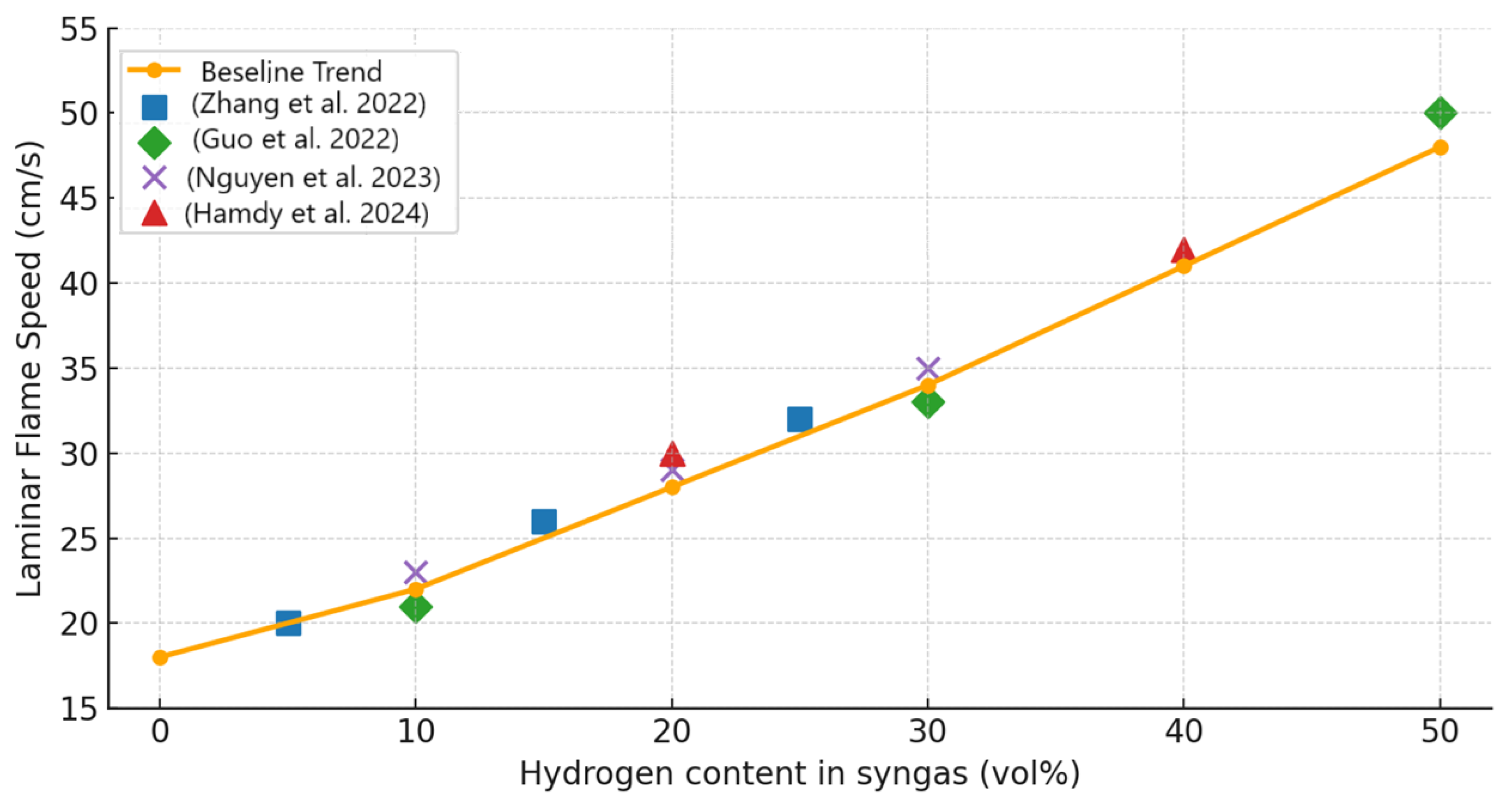 - Contradictions in the effect of hydrogen enrichment: Hydrogen is widely acknowledged as the most influential component of syngas due to its high diffusivity and reactivity. Most studies report that increasing H2 reduces ignition delay and enhances flame speed [90,120]. Yet the effect on NOx emissions remains inconsistent: some works show higher H2 fractions increase NOx due to higher flame temperatures [66], while others find the opposite under lean conditions, where faster burning reduces residence times at peak temperatures [86]. These contradictory findings highlight the strong dependence on boundary conditions, especially equivalence ratio and dilution levels.