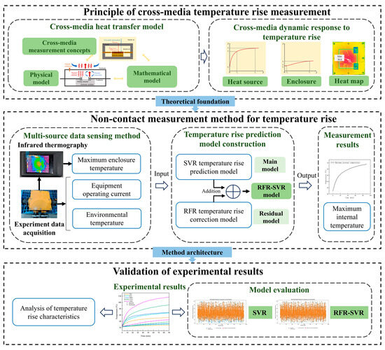 Therefore, this paper addresses the practical needs of temperature rise monitoring for coal mine electrical equipment by proposing a non-contact temperature measurement method based on cross-media infrared measurement. First, in response to the complex internal structure of the equipment, which involves multiple media and intricate heat transfer paths, a cross-media temperature rise measurement principle is introduced. This principle enables the indirect estimation of the internal heat source temperature through the surface temperature of the enclosure, providing a solid theoretical foundation for non-contact measurement. By analyzing the dynamic temperature response between the equipment enclosure and the internal heat source, the challenges associated with cross-media measurement were identified, including the thermal inertia of the enclosure, heat transfer hysteresis, and the dynamic variability of the maximum temperature point on the enclosure. The advantages of using infrared thermography for measuring the equipment enclosure were also analyzed. Second, building upon infrared temperature measurement, equipment operating current and environmental temperature parameters are introduced to construct a multi-source data perception method, achieving comprehensive perception of the equipment’s thermal state. Based on this, a hybrid prediction model combining Support Vector Regression (SVR) and Random Forest Regression (RFR) is proposed, effectively addressing the issue of low prediction accuracy in the low-temperature range and significantly improving the modeling and prediction accuracy of the internal maximum temperature. This research aims to provide an effective solution for intelligent, non-contact temperature rise monitoring of coal mine electrical equipment, with significant implications for enhancing thermal safety design, structural optimization, operational reliability, and safety monitoring.
