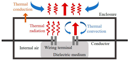 There are three main modes of heat transfer in the flameproof junction box: thermal conduction, thermal convection, and thermal radiation [30]. The primary forms of heat transfer include: (i) thermal conduction between solids such as the conductor, enclosure, and dielectric medium; (ii) thermal radiation between different components; (iii) convective heat transfer between the air inside the enclosure and the conductor; and (iv) natural convective heat transfer between the enclosure and the external atmosphere. Given the structure of the flameproof junction box, the dielectric medium is ceramic and exhibits low thermal conductivity; accordingly, as the upper enclosure is used for measurement, the influence of heat transfer through the dielectric medium is disregarded. A schematic diagram of the heat transfer mechanisms is shown in Figure 3.