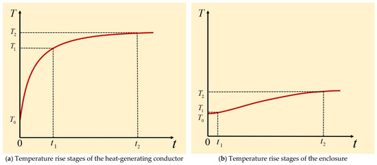 The primary heat source within the flameproof junction box is the current-carrying conductor. As illustrated in Figure 4, the temperature rise process of both the conductor and the enclosure can be characterized by three distinct stages, reflecting the transition from a non-equilibrium state to steady-state conditions.