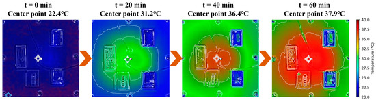 Considering the high emissivity characteristics of painted metal surfaces, the emissivity of the infrared thermal imager was set to 0.93, in accordance with values recommended by ASTM [34] standards. Applying the equipment’s specified rated current of 100 A ensured operation at the rated power. As shown in Figure 5, infrared thermography measurements of the flameproof junction box during the power-on process reveal the dynamic evolution of the surface thermal field over time. At the initial stage of power-on, the overall temperature distribution of the equipment is relatively uniform, with no significant thermal concentration areas observed. As the power-on duration increases, heat generated by the internal source gradually accumulates, resulting in the emergence of an elliptical high-temperature region at the center of the equipment surface. Heat diffuses outward from the center, forming a typical radial thermal diffusion pattern. During this process, the temperature gradient gradually decreases from the center toward the edges, indicating that the spatial extent of the concentrated heat source is expanding. Consequently, the thermal field of the equipment transitions from a locally non-uniform distribution to a globally distributed pattern.