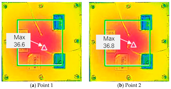 Figure 6 illustrates the variation in the thermal field of the flameproof junction box during operation. The red triangle in Figure 6 indicates the location of the highest temperature point. A comparison between Point 1 in Figure 6a and Point 2 in Figure 6b shows that the location of the maximum enclosure temperature consistently corresponds to the area directly above the primary internal heat-generating component. However, its exact position shifts with changes in the operating state. This phenomenon indicates that the surface thermal field of the enclosure is influenced by the coupling of multiple internal heat sources. When local heat generation increases or the thermal resistance path changes, the distribution of heat is correspondingly redistributed, resulting in the migration of the maximum temperature point.