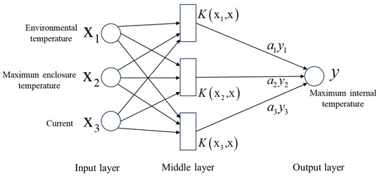 The Radial Basis Function is adopted as the kernel function. The model takes the maximum enclosure temperature, environmental temperature, and equipment operating current as inputs, and the maximum internal temperature as the output. The overall modeling framework is illustrated in Figure 7. The training dataset is defined as follows: