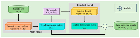 The RFR-SVR model first uses SVR to learn the main trend relationship between the input features and the internal temperature. After obtaining the model’s prediction results, the residual is calculated as follows: