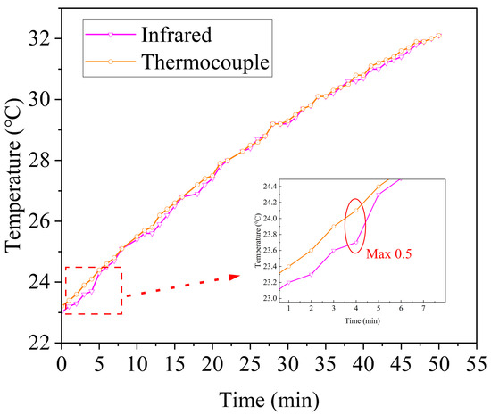The accuracy of surface temperature measurement via infrared thermography critically influences the reliability of predicting the internal temperature of equipment. To ensure measurement precision, the HIKMICRO TK20 infrared thermal imager was calibrated and validated through controlled experiments. Key measurement parameters were strictly configured according to the actual environmental conditions: ambient temperature was set to 23.1 °C, relative humidity to 60.7%, measurement distance to 0.9 m, and emissivity to 0.93 based on the painted surface coating material. Calibrated type-K thermocouples with an accuracy of 0.5 °C were mounted at specified locations on the equipment enclosure, while the thermal imager simultaneously captured temperature readings at the same points. As shown in Figure 9, the comparative results of temperature rise measurements indicate a peak deviation of 0.5 °C between the infrared thermal imager and the thermocouple readings, which meets the accuracy requirements for engineering applications.