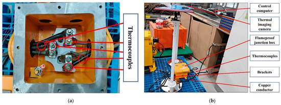 The temperature rise test platform is shown in Figure 10. A flameproof junction box with a rated current of 100 A was selected as the test object, and 35 mm2 copper conductors were used for electrical connections. Infrared thermal imaging was used to locate high-temperature points inside the equipment. As shown in Figure 10a, the positions of the wiring terminals, input wires, and output wires were selected as temperature measurement points. The junction box was powered under a series of different current conditions (70 A, 85 A, 100 A, 115 A, 130 A) for testing.