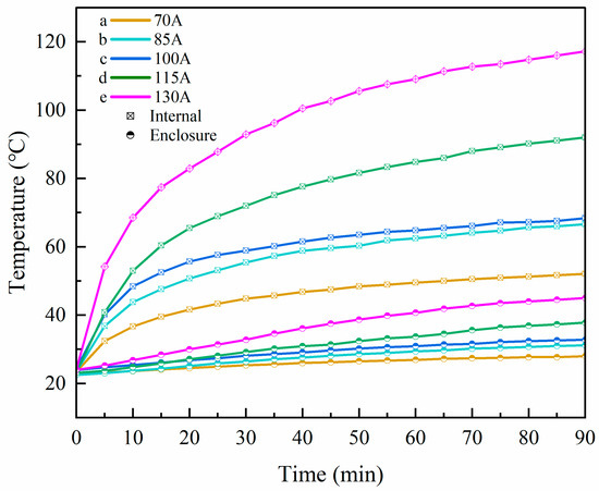 Figure 11 presents comparative curves of the maximum enclosure temperature and maximum internal temperature over time under five different current conditions. Overall, under all test currents, both the enclosure and internal temperatures exhibit a synchronous rising trend. The internal temperature consistently exceeds the enclosure temperature, indicating that the primary heat source is concentrated within the internal conductor, and heat is transferred to the enclosure via thermal conduction paths.