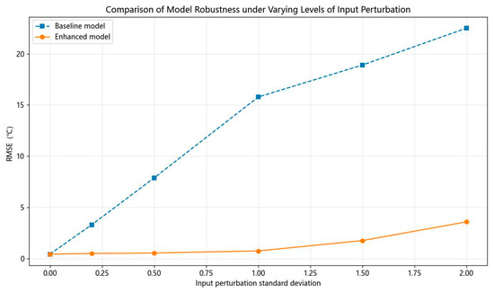 As shown in the line chart in Figure 12, which compares the robustness of the model before and after data augmentation, the RMSE varies with the standard deviation of input perturbation ranging from 0 to 2. The results indicate that the RMSE of the model without data augmentation increases significantly by more than 20 °C under input noise, whereas the model with data augmentation is far less affected, with RMSE remaining below 5 °C, demonstrating strong robustness against noise.