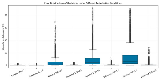 Figure 13 presents box plots illustrating the prediction error distributions under varying levels of input perturbation. The line within each box represents the median of the data. The median of the enhanced model remains consistently close to 0 °C across all conditions. In contrast, while the baseline model exhibits a median error near 0 °C when no perturbation is applied, its median increases to approximately 2.1 °C, 4.4 °C, and 6.0 °C at standard deviation levels of 0.5, 1.0, and 1.5, respectively. As the standard deviation of the perturbation increases, the model trained without data augmentation shows a higher median, a broader range of concentrated prediction errors, and a considerable number of extreme outliers. On the other hand, the model trained with data augmentation maintains a median error close to 0 °C and a tightly clustered error distribution, even under high noise levels.
