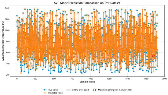 The SVR model has a cross-validation average R2 = 0.989, and a test set R2 = 0.989. The standard deviation of R2 for both cross-validation and the test set is 0, excluding the risk of overfitting. The MAPE is 2.719%, the RMSE is 2.848 °C, and the MAE is 1.351 °C. The RMSE exceeds the MAE by more than 1.4 °C, indicating the presence of some samples with large errors. This suggests that the generalization capability of the SVR model is relatively poor. As shown in Figure 14, the temperature prediction comparison of the SVR model on the test set shows a significant discrepancy between the predicted and actual values when the maximum internal temperature is below 40 °C. This phenomenon is consistent with the analysis of the enclosure’s temperature rise dynamic response. Due to thermal inertia, during the first stage of the slow temperature rise, the enclosure’s temperature change is small, while the internal temperature change is large. The complex nonlinear relationship between the enclosure and internal temperature rise makes it difficult for the SVR model to learn effectively.