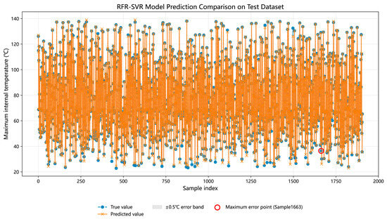 As shown in Table 2, the RFR-SVR model has a cross-validation average R2 = 0.999 and a test set R2 = 0.999, with an R2 standard deviation of 0 for both cross-validation and the test set, thus excluding the risk of overfitting. The MAPE is 0.802%, the RMSE is 0.741 °C, and the MAE is 0.464 °C. The small difference between the RMSE and MAE indicates the absence of large error samples. As shown in Figure 15, the temperature prediction comparison of the RFR-SVR model on the test set demonstrates that the RFR-SVR model significantly outperforms the SVR model, especially addressing the issue of high temperature prediction error in the low-temperature range seen in the SVR model.