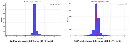 As shown in Figure 16, the model prediction error distribution histogram, in Figure 16a, the prediction errors of the SVR model are mainly concentrated within the ±5 °C range, with an average error of 0.238 °C. However, the distribution shows a significant right skew, with multiple samples having errors greater than 10 °C. Figure 16b shows the prediction error distribution of the RFR-SVR model. Compared to Figure 16a, the error distribution of the RFR-SVR model is more concentrated near zero, mainly within the ±2 °C range. The number of extreme error samples is significantly reduced, and the average error is −0.016 °C. This indicates that the RFR-SVR model effectively reduces the prediction errors while maintaining its ability to fit the main trend, with a more compact and balanced error distribution, demonstrating greater overall stability.