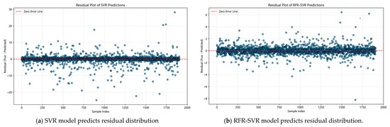 As shown in Figure 17, the model prediction residual distributions are presented. In Figure 17a, the residuals of the SVR model fluctuate within ±10 °C for most samples, However, notable outliers are observed, with some residuals exceeding 20 °C, indicating a fitting bias for certain data points. In contrast, Figure 17b shows the residual distribution of the RFR-SVR model, which is more concentrated. Most residuals fall within the ±2 °C range, which is much narrower than that of the SVR model. Although a few large error points remain, none exceed 10 °C, and the number of extreme residuals is significantly reduced, demonstrating improved robustness and overall prediction stability.