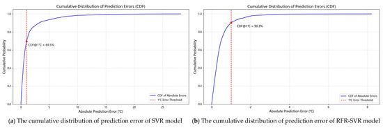Figure 18 shows the CDF of the prediction errors for the SVR and RFR-SVR models. In Figure 18a, the CDF value for the SVR model at the 1 °C threshold is 69.5%, indicating that approximately 70% of the predicted samples have an error below 1 °C. However, a considerable proportion of samples still exhibit large prediction errors. In contrast, Figure 18b shows that the CDF value for the RFR-SVR model at the 1 °C threshold reaches 90.3%, indicating that most samples have errors within 1 °C. These results demonstrate that the RFR-SVR model achieves better prediction accuracy and overall stability compared to the SVR model.