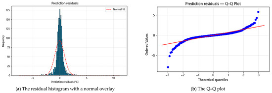 To evaluate the prediction residuals of the RFR–SVR model, distribution diagnostics were performed on the prediction residuals from the test set. As shown in Figure 19, the normal-overlaid residual histogram (Figure 19a) reveals that errors are tightly clustered around zero with a sharper peak than the Gaussian reference, indicating a leptokurtic distribution. The quantile–quantile (Q–Q) plot (Figure 19b) closely follows the reference line across the central quantiles, demonstrating near-normality in the central region, while systematic S-shaped deviations are observed in both tails. This combination of a sharp central peak and tail deviations is consistent with a mixture of operating regimes: the majority of samples correspond to low-noise steady states, while a small number of extreme or transient conditions produce heavier tails and mild skewness. Such behavior is typical in engineering datasets and has a negligible impact on the overall model performance.