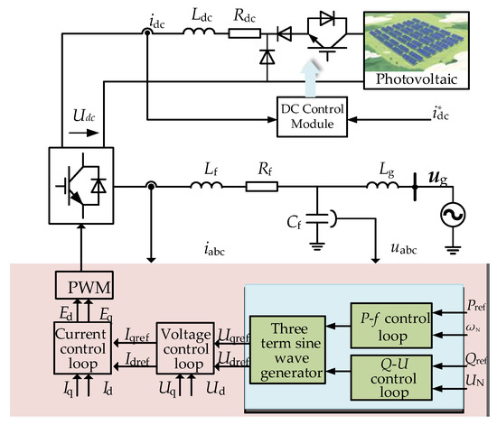 The circuit structure and control architecture of the droop-controlled distributed PV grid-connected system are illustrated in Figure 1 and Figure 2. In Figure 1, the system is composed of a photovoltaic array, a DC-side supporting capacitor (Udc), a grid-connected inverter (integrating a power electronic converter topology and a control module), filtering and line components (Lf, Rf, Cf, and Lg), and the power grid (ug). Figure 2 shows the control loop of the photovoltaic device, which consists of an active-power loop and a reactive-power loop. After the converter output side and the filter circuit, the AC current measurement (iabc) and AC voltage measurement (uabc) are set. Among them, (iabc) is used to extract the d-axis and q-axis components of the current (Id, Iq), which participate in the feedback regulation of the inner control loop of the converter; uabc is used to obtain the d-axis and q-axis components of the voltage (Ud, Uq) to support the operation of the voltage control loop.