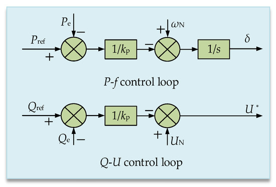 The active-power-frequency control and reactive-power-voltage control equations of the droop-controlled inverter are given in Equations (1) and (2), respectively [27].