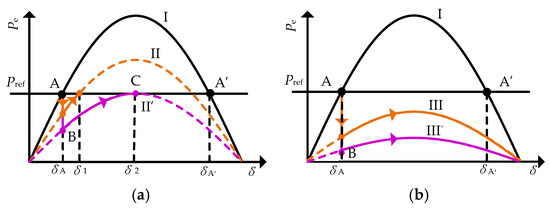 Figure 3a indicates the existence of a power balance point during a fault. Taking curve II′ as an example, after the fault is cleared, the system operating point jumps from point A to point B, moves along curve II′, and finally achieves transient stable operation at point C. The system then operates at point C, which is a power balance point. Figure 3b presents the scenario where there is no power balance point during the fault. Initially, the system operates at point A. After the fault occurs, the power angle continues to increase and eventually becomes unstable because Pref − Pe > 0. In other words, if there is no power equilibrium point in the system during a fault, the fault must be cleared before the power angle reaches δA′; otherwise, the droop-controlled inverter will become unstable, at least during the first oscillation cycle.