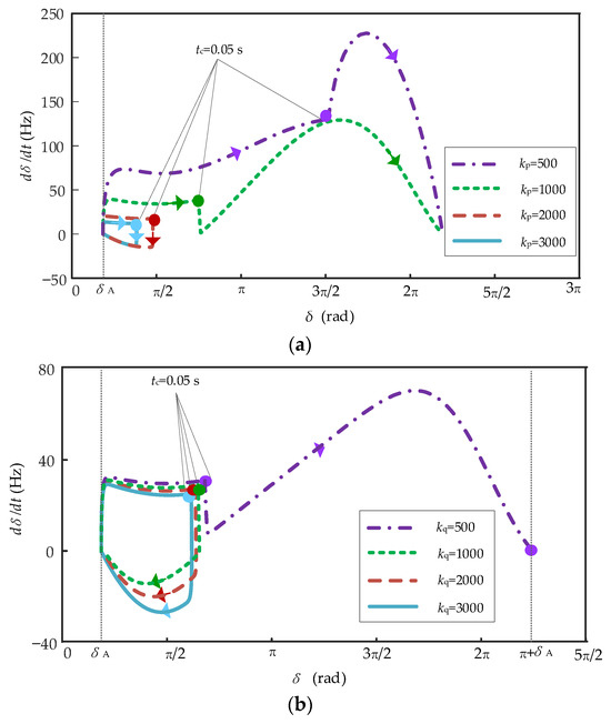 Phase portraits of a droop-controlled VSC with different control parameters: (a) kq = 1500; (b) kp = 3000.