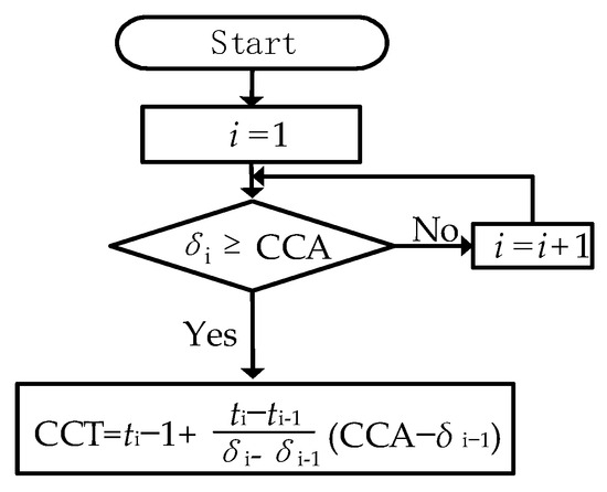 CCT refers to the time interval corresponding to the power angle moving from δA to the CCA. In this paper, numerical and iterative calculations are used to determine the CCT. Based on Equation (11), the numerical solutions for the time series [t0, t1, t2, …, ti] and the power angle sequence [δA, δB, δC, …, δi] can be obtained using the Runge–Kutta algorithm [29].